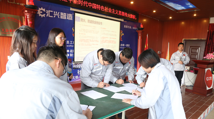璞玉有瑕,有先進,就有落后,有表揚,就有懲戒。沒有規(guī)矩,不成方圓,所以大會的第四個議程對公司管理制度做了進一步宣講和引導。人事經理袁侃結合實際案列,諄諄告誡全體員工遵守法律、行政法規(guī)、公司制度,不要以身試法、以身犯險。并發(fā)起第五個會議議程,倡議匯興智造全體員工簽訂《防火、防盜安全協(xié)議書》,各部門負責人率先上臺在協(xié)議書上簽字,用實際行動表決心。