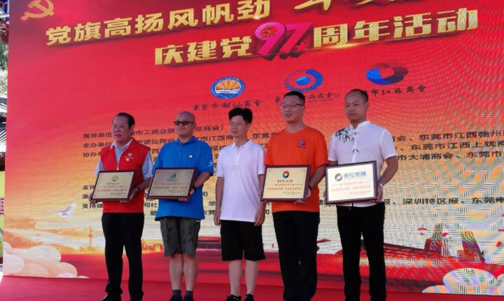 市工商聯(lián)(總商會(huì))副主席張軍民(中間)為活動(dòng)主辦單位授予榮譽(yù)牌匾,東莞市江西商會(huì)黨支部書記、匯興智造董事長鐘輝(左二)代表商會(huì)上臺(tái)