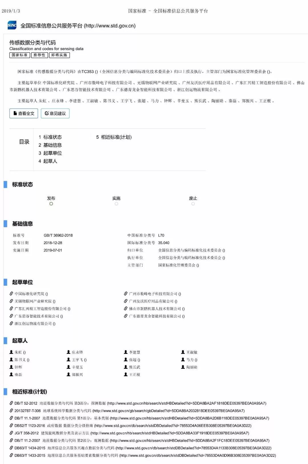 1月10日,國家市場監(jiān)督管理總局、國家標(biāo)準(zhǔn)化管理委員會發(fā)布了《中華人民共和國國家標(biāo)準(zhǔn)公告》2018年第17號。由匯興智造參與起草的國家標(biāo)準(zhǔn)《傳感數(shù)據(jù)分類與代碼》獲準(zhǔn)公布,并將于2019年7月1日開始實(shí)施。