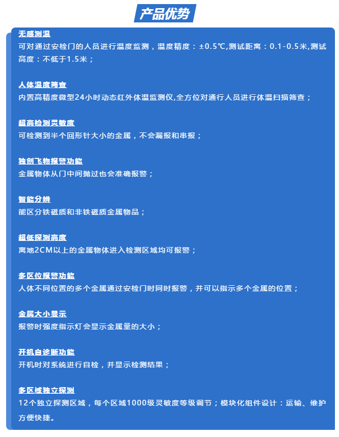 匯興智造人體測溫安檢門將集紅外測溫和金屬檢測為一體化,可對通過安檢門的人員進行溫度測試,如若超過安全溫度閾值將聯動安檢門聲光報警,有效對人員進行篩查并建立首道防線。